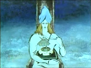 Ya digo que la estética del corto es bastante llamativa y tal vez su mayor baza. El caso es que me ha parecido ver ecos de ella en otros cortometrajes rusos. Hay un momento en Steklyannaya garmonika (Andrey Khrzhanovsky, 1968) en que la pantalla se llena de monstruos y de seres extraños muy similares a los vistos en El califa cigüeña. Lo cierto es que Valery Ugarov trabajó como animador en el corto de Khrzhanovsky, así como en Zhil-Bil Kozyavi (1966), del mismo autor. Ambos cortometrajes exhiben una estética muy particular, y en cierto modo anticipan ya algunos aspectos, tendencias, de lo que luego Ugarov desarrollará en nuestro título, quince años más tarde. Por su parte, Anatoly Petrov, otro grande de la animación rusa, que aquí trabaja como guionista, había dirigido en 1968 Kalejdoskop 68-Begemot, protagonizado un hipopótamo de aspecto no muy direferente al de los mosntruos que hemos descrito más arriba.